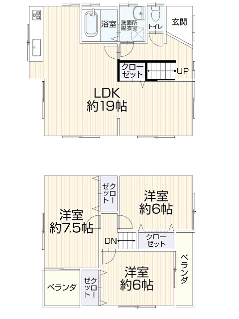 1階LDK19畳 2階洋室7.5畳 2階洋室6畳 2階洋室6畳
