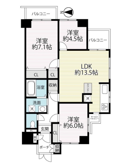 間取内容 | 洋室6畳 LDK13.5畳 洋室7.1畳 洋室4.5畳 |