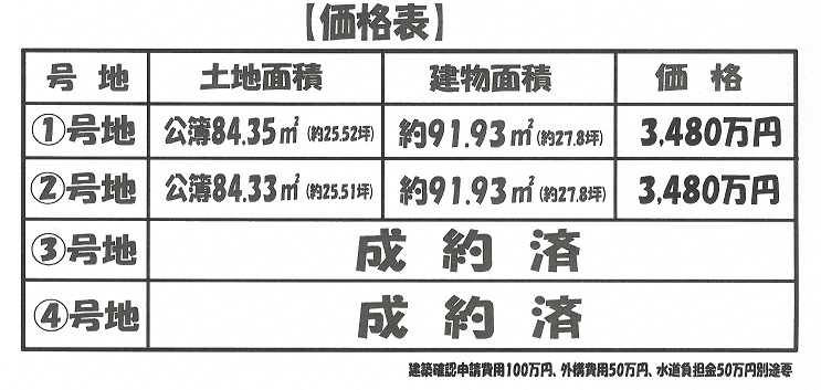 | 設備・条件 | システムキッチン カウンターキッチン 独立洗面台 バス・トイレ別 W.INクローゼット 室内洗濯機置き場 都市ガス 公営水道 排水下水 駐車場有 バルコニー フローリング  ■土地先行決済となります。 ■建築確認申請費用100万円、外構費用50万円、水道負担金50万円別途要 ※完成時期:契約後6ヶ月  |