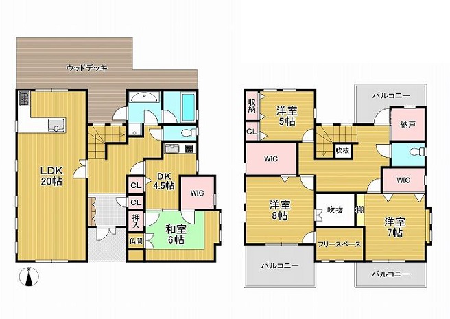 | 間取内容 | 1階LDK20畳 1階DK4.5畳 1階和室6畳 2階洋室8畳 2階洋室7畳 2階洋室5畳 2階S 1階にミニキッチン有り |