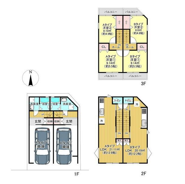 間取内容 2階LDK12.8畳Aタイプ室  3階洋室4.9畳Aタイプ室  3階洋室5.5畳Aタイプ室  2階LDK12.2畳Bタイプ室 3階洋室4.8畳Bタイプ室 3階洋室5.5畳Bタイプ室