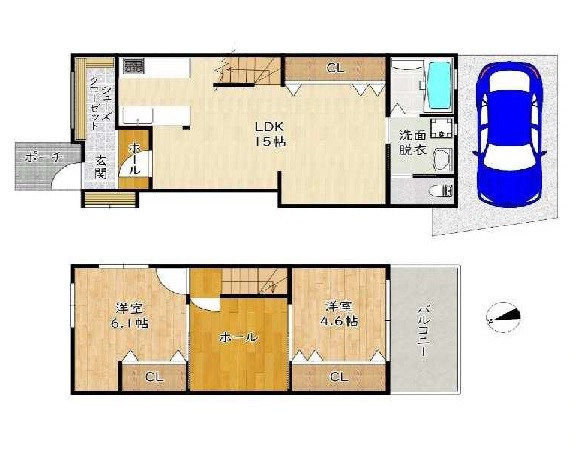 | 間取内容 | 1階LDK15畳 2階洋室6.1畳 2階洋室4.6畳 |
