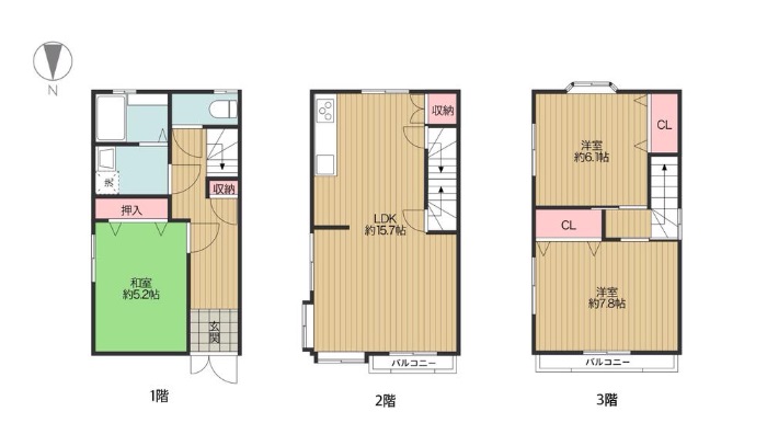 | 間取内容 | 1階和室5.2畳 2階LDK15.7畳 3階洋室7.8畳 3階洋室6.1畳 |