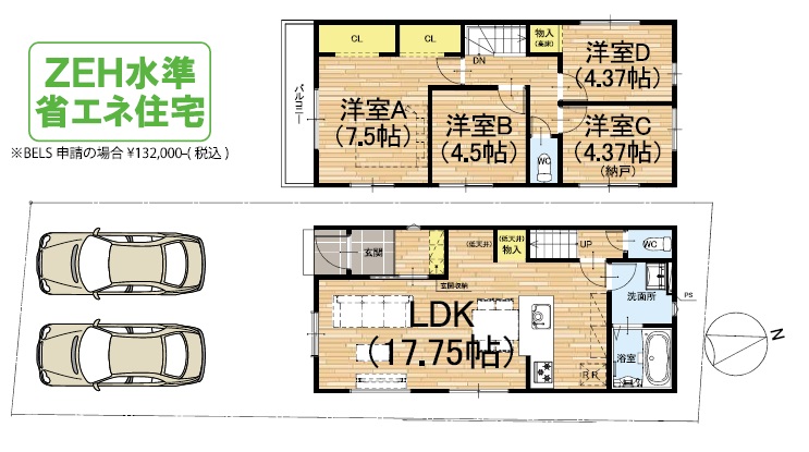 間取内容 1階LDK17.75畳 2階洋室7.5畳 2階洋室4.5畳 2階洋室4.37畳 2階洋室4.37畳