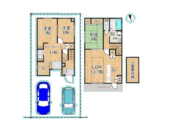 | 間取内容 | 1階その他4.5畳 1階洋室7畳 1階洋室6畳 2階LDK13.7畳 2階和室6畳 |