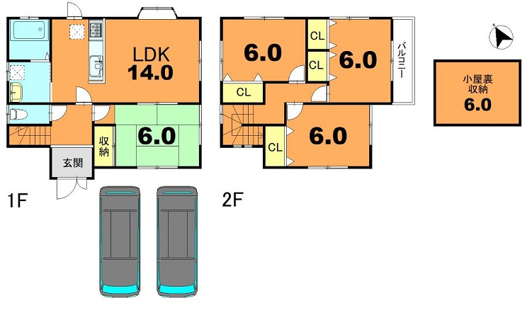 | 間取内容 | 1階LDK14畳 1階和室6畳 2階洋室6畳 2階洋室6畳 2階洋室6畳 +小屋根収納6帖 ★全居室6帖以上 |