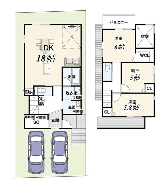 間取内容 1階LDK18畳 2階洋室6畳 2階洋室5.8畳 2階S5畳