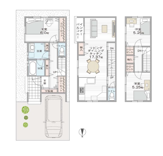 | 間取内容 | 1階洋室6畳 2階LDK17.37畳 3階洋室5.25畳 3階洋室5.25畳 |