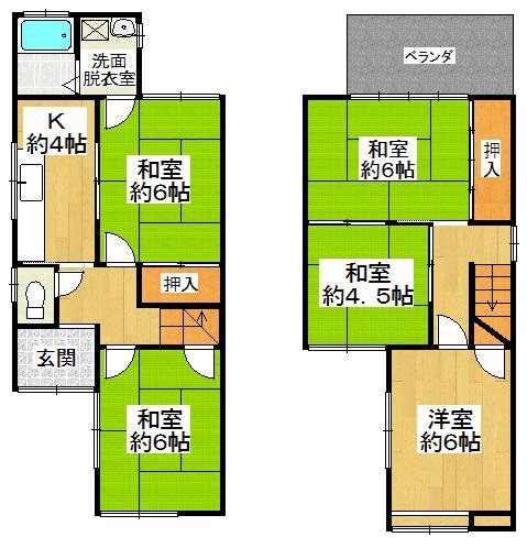 1階K4畳 1階和室6畳 1階和室6畳 2階洋室6畳 2階和室4.5畳 2階和室6畳