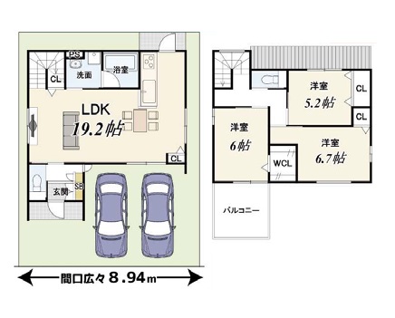 1階LDK19.2畳 2階洋室6畳 2階洋室6.7畳 2階洋室5.2畳