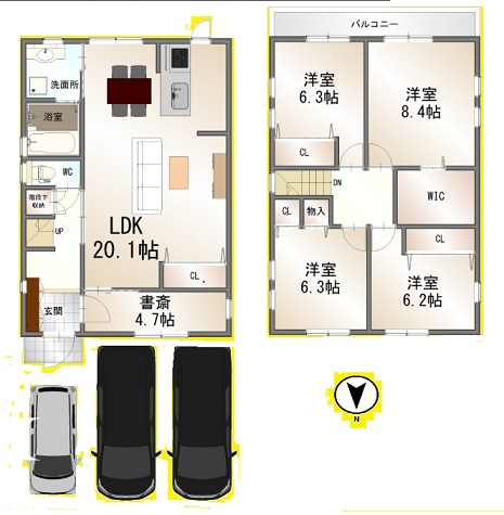 1階LDK20.1畳 1階その他4.7畳書斎室 2階洋室8.4畳 2階洋室6.3畳 2階洋室6.3畳 2階洋室6.2畳