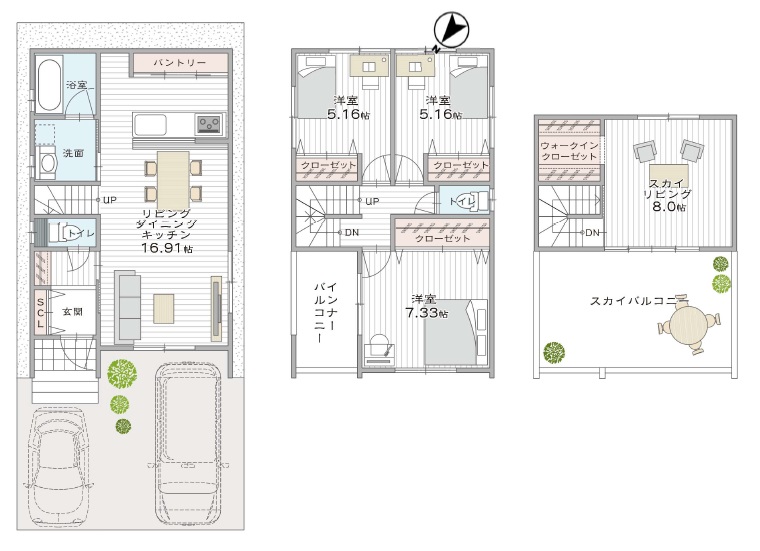 | 間取内容 | 1階LDK16.91畳 2階洋室7.33畳 2階洋室5.16畳 2階洋室5.16畳 3階L8畳 |