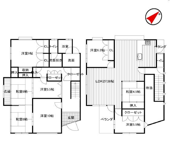| 間取内容 | 1階洋室10畳 1階和室6畳 1階和室6畳 1階洋室5.5畳 1階洋室9畳 2階和室4.5畳 2階洋室5.5畳 2階洋室6.2畳 2階LDK27.38畳 |