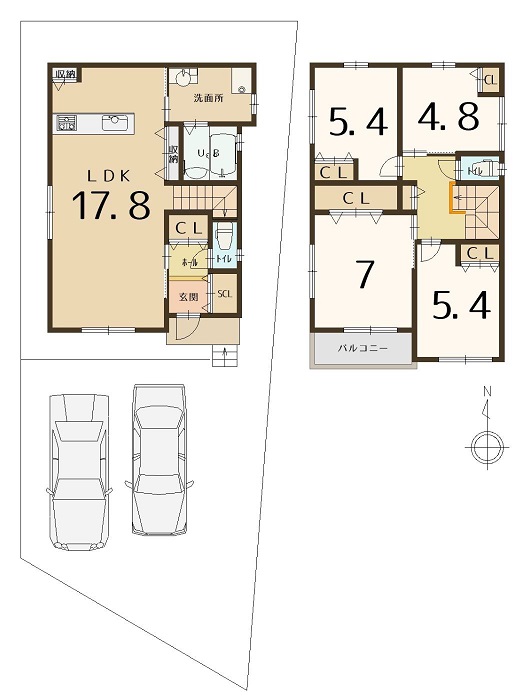 | 間取内容 | 1階LDK17.8畳 2階洋室7畳 2階洋室5.4畳 2階洋室5.4畳 2階和室4.8畳 |