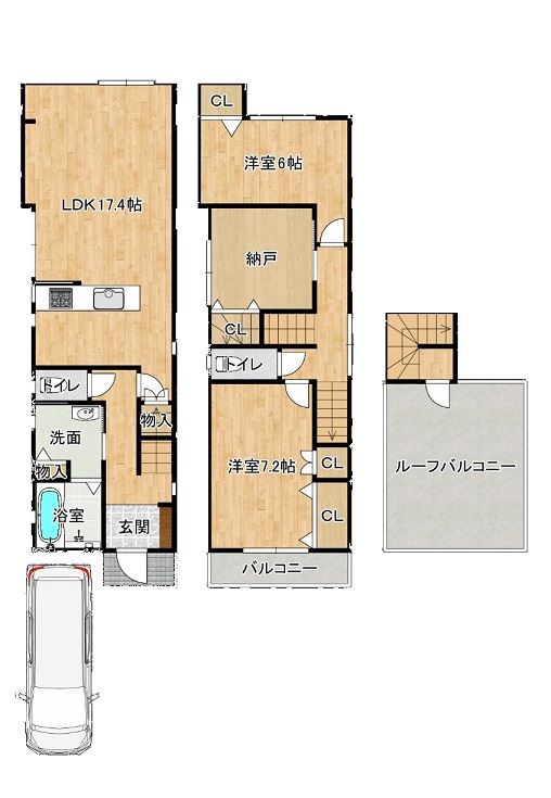 1階LDK17.4畳 2階洋室7.2畳 2階S4.5畳 2階和室6畳